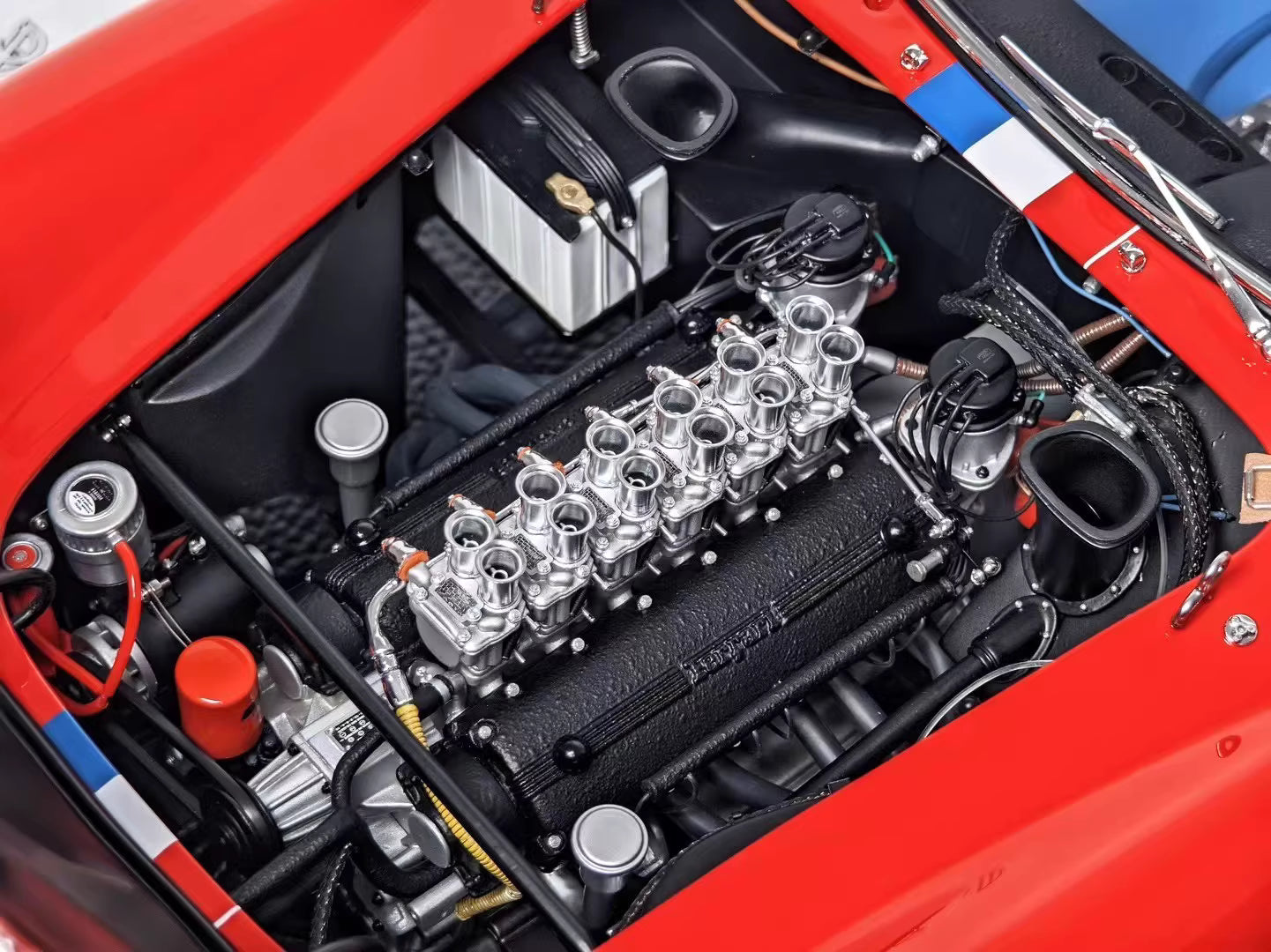 Each model is handcrafted and painted by Amalgam’s master artisans, using premium resin, metal, and leather-textured components. The Rosso Corsa bodywork with its distinctive blue and white racing stripes perfectly reflects Ferrari’s early 1960s endurance racing style. The cockpit features full instrumentation, detailed gear lever, and race harnesses — all finished to museum-grade standards.