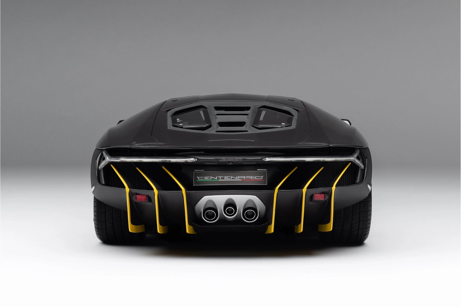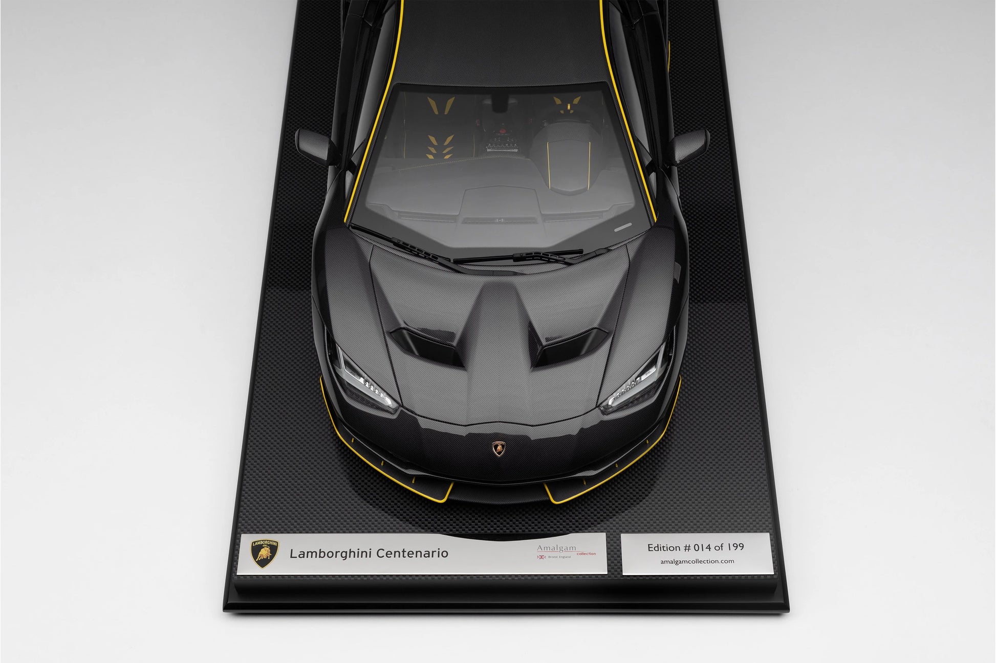 This 1/8 scale model by Amalgam Collection has been meticulously developed using official Lamborghini design data and surface scans to ensure perfect accuracy. The carbon black finish is accented by vibrant yellow aerodynamic highlights, faithfully reproducing the original Centenario launch specification. The model captures every curve, vent, and signature detail — from the scissor doors to the intricate wheels and interior cockpit layout.