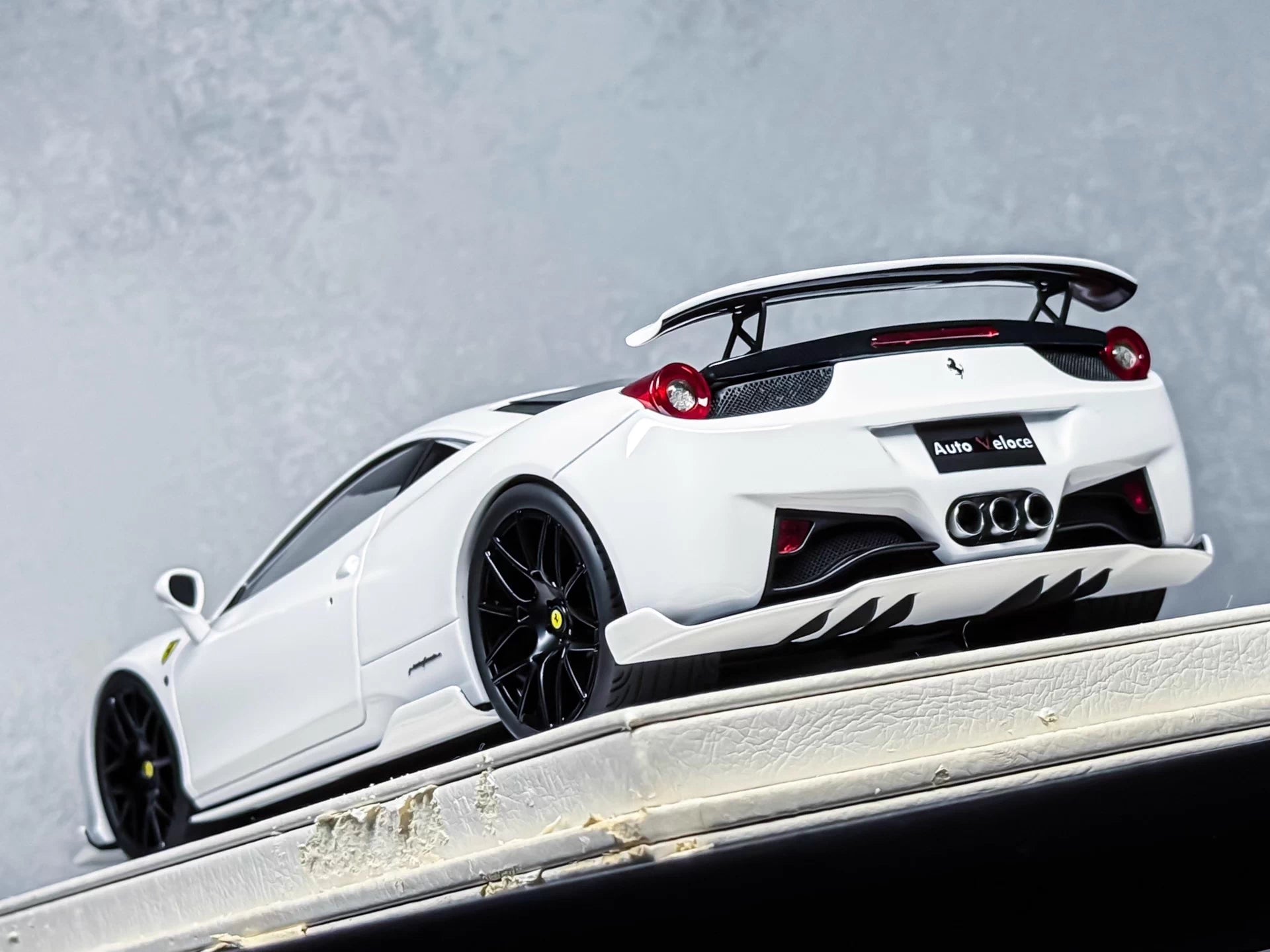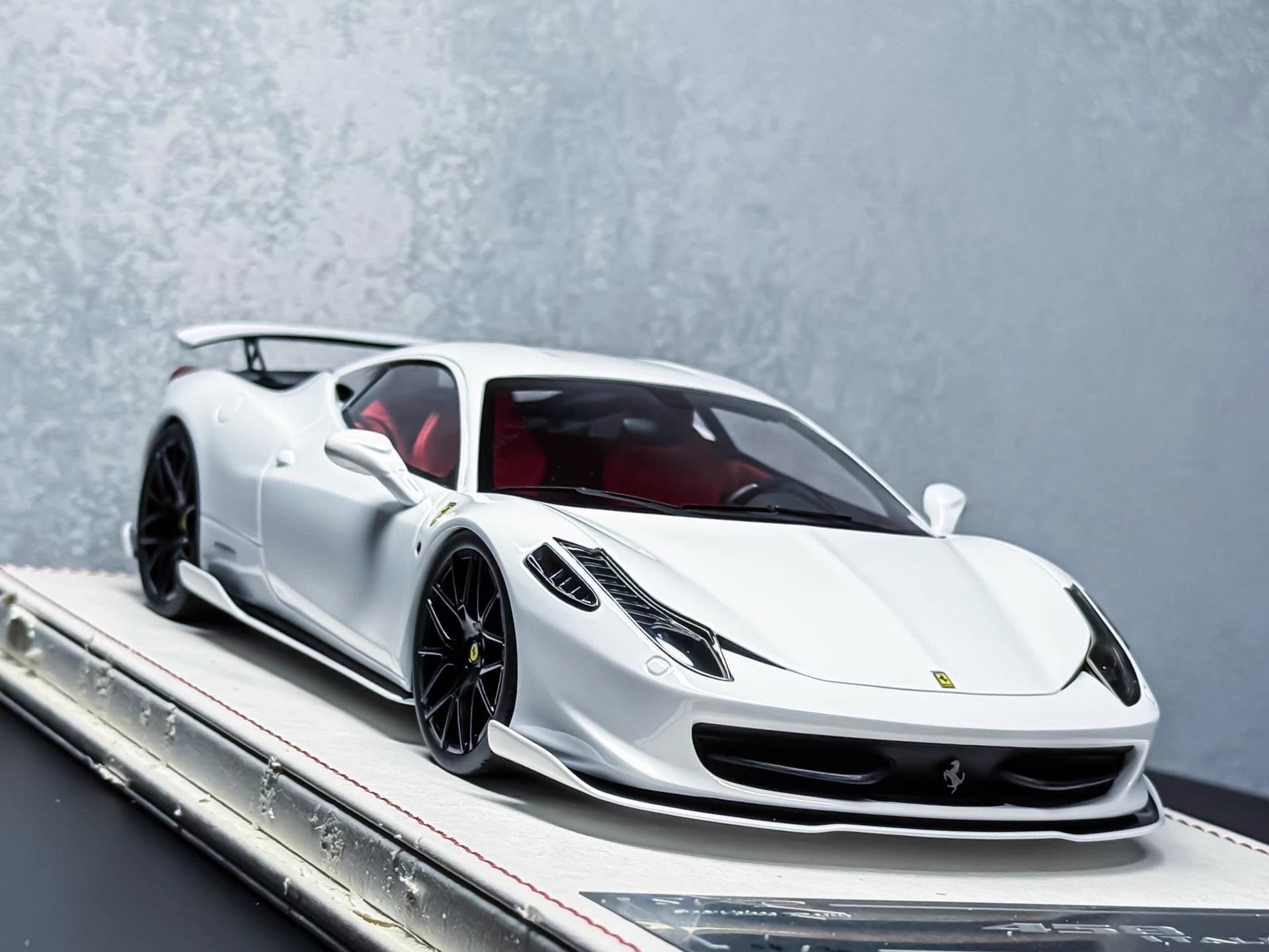 A clean pearl-white 458 Italia SVR with a sharp, modern stance—black wheels and aggressive aero details framed by a deep red interior. This is an early-era Davis & Giovanni release recognized by collectors for its premium materials and refined surface quality, presented on a luxury stitched display base.