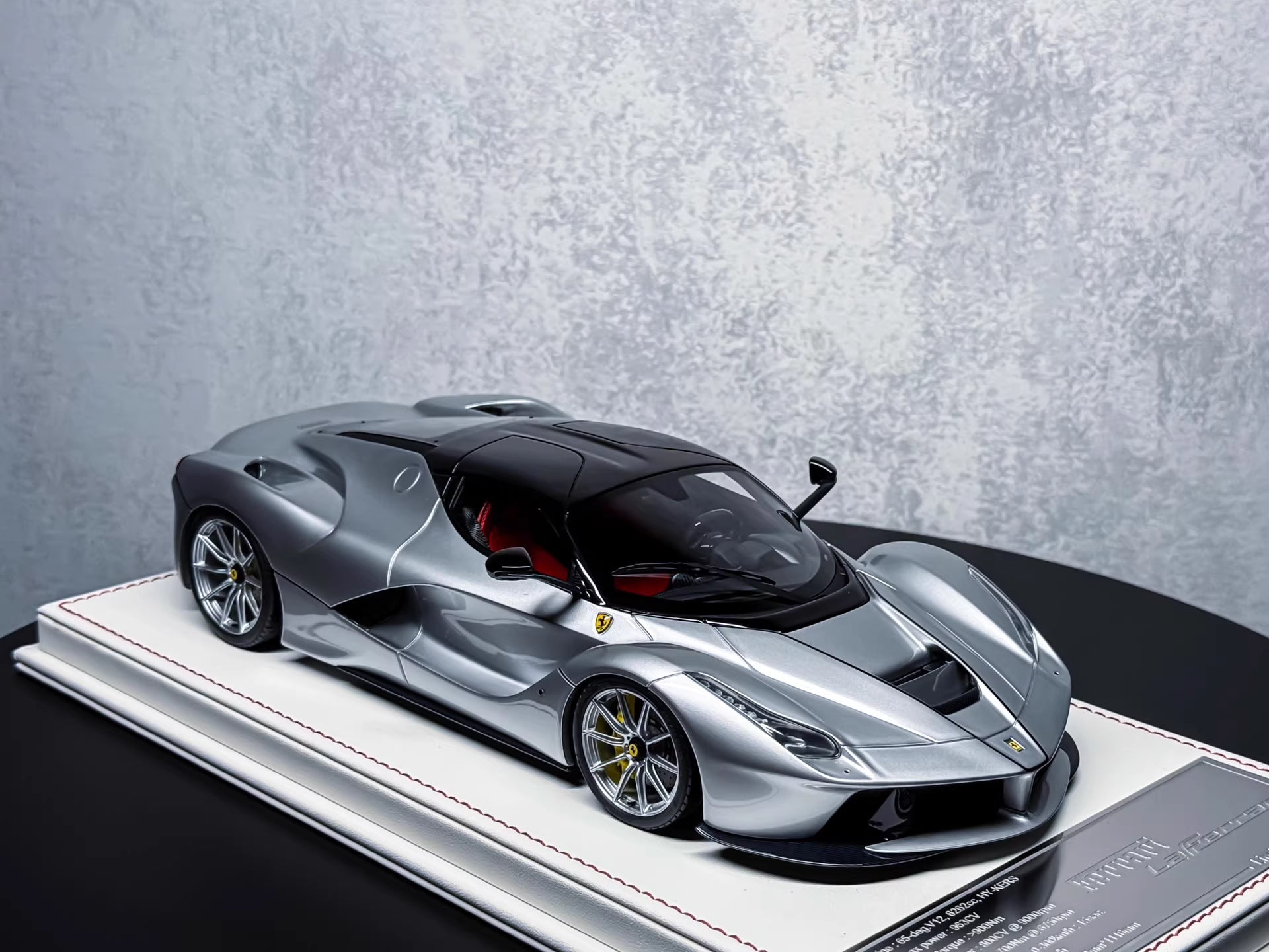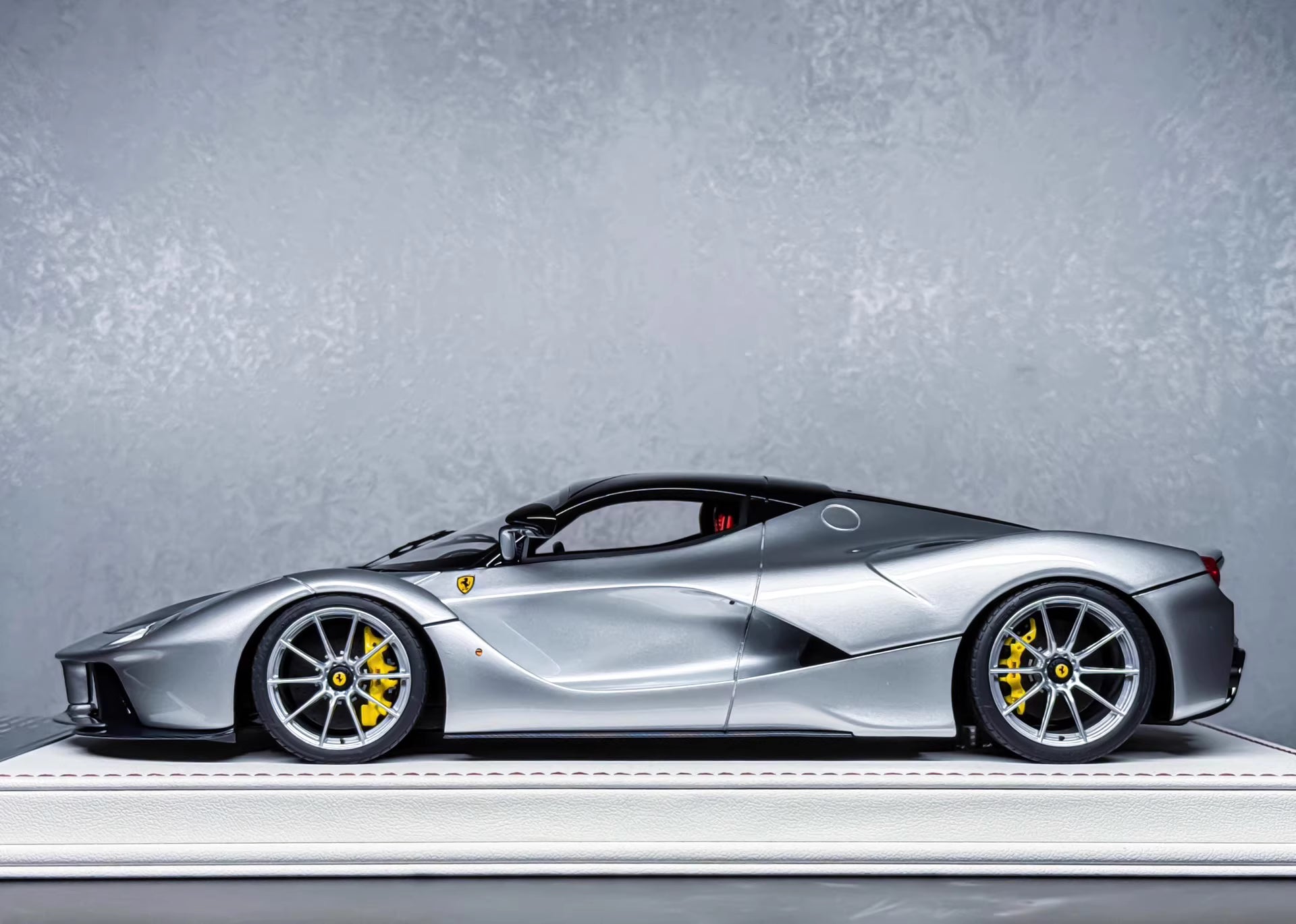 A sleek metallic-silver LaFerrari interpretation finished with a clean, fluid sheen and an aggressive stance. This collector-grade resin piece is designed for display-first perfection—crisp panel lines, ultra-smooth paintwork, and a premium presentation that pairs beautifully with the silver body and red cabin accents.