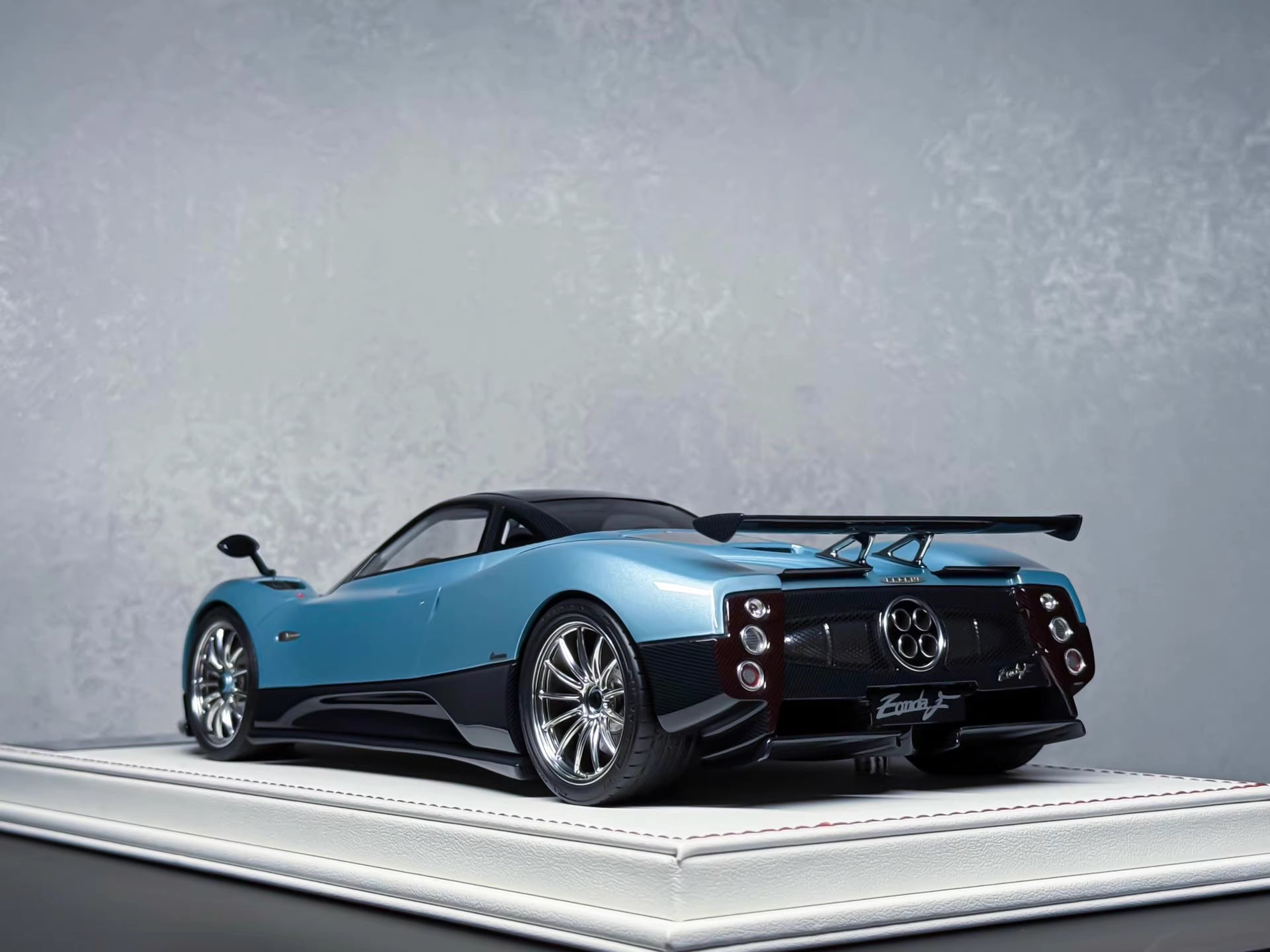 A refined Zonda F finished in a calm ice-blue tone that reads clean and modern under display lighting. The crisp white interior elevates the contrast, while chrome-finish wheels and chrome engine detailing deliver a premium, jewelry-like highlight across the entire build.
