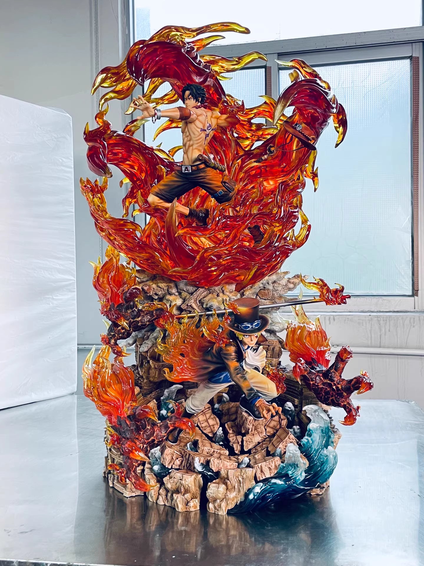 Every detail—from the textured rocks and waves at the base to the translucent fire swirling around the three brothers—is meticulously hand-painted to create a vivid, anime-accurate presence. This is not a toy, but a premium collector centerpiece from the One Piece universe.